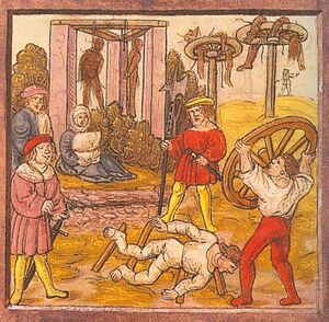 The survival time after being "wheeled" or "broken" could be extensive. Accounts exist of a 14th-century murderer who remained conscious for three days after undergoing the breaking wheel.[3] In 1348, during the time of the Black Death, a Jewish man named Bona Dies underwent the punishment. The authorities stated he remained conscious for four days and nights afterwards.[4] In 1581, the German serial killer Christman Genipperteinga remained conscious for nine days on the breaking wheel before expiring, having been deliberately kept alive with "strong drink".[5]