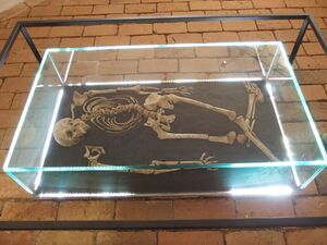 Since victims' bodies of the breaking wheel were often left exposed to environmental influences over a long period of time, hardly any archaeological features for the "breaking wheel" exist; as a deterrence, the bodies were often left on public display over many years, exposed to wind and weather, birds and other scavenging animals could also take away the remains and bones. In the German-speaking areas, only a few archaeological discoveries of breaking wheel victims have been documented. In autumn 2013, the skeleton of a man was found in Groß Pankow, Germany, during the laying of Federal Highway 189 (Bundesstraße 189) between Perleberg and Pritzwalk in Brandenburg, whose position and signs of injury indicate death by the "breaking wheel".[24] Based on an iron belt buckle, the skeleton was dated to the 15th to 17th centuries. The identity of the man is unknown.[24] A similar archaeological find has since also been discovered in 2014, in Pöls-Oberkurzheim, Styria, Austria.