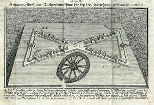 The breaking wheel, also known as the execution wheel, the Wheel of Catherine or the (Saint) Catherine('s) Wheel, was a torture method used for public execution primarily in Europe from antiquity through the Middle Ages up to the 19th century by breaking the bones of a criminal or bludgeoning them to death. The practice was abolished in Bavaria in 1813 and in the Electorate of Hesse in 1836: the last known execution by the "Wheel" took place in Prussia in 1841. In the Holy Roman Empire, it was a "mirror punishment" for highwaymen and street thieves, and was set out in the Sachsenspiegel for murder, and arson that resulted in fatalities.[1]