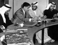 الشيوخ راشد بن سعيد آل مكتوم ومكتوم بن راشد آل مكتوم ومحمد بن راشد آل مكتوم مع المستشار القانوني عدي البيطار عام 1968 في ديوان الحاكم بدبي