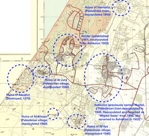 ومدينة عسقلان هي مدينة المجدل وبعد تهجير أهلها وسكنها الاسرائيليين توسعت المدينة لتضم قرية الجورة وحمامة التي أيضا تم تهجير أهلها. وسميت بعسقلان نسبة إلى الميناء القديم الذي توجد آثاره بالقرب منها.