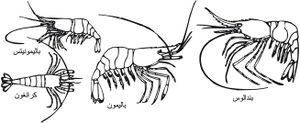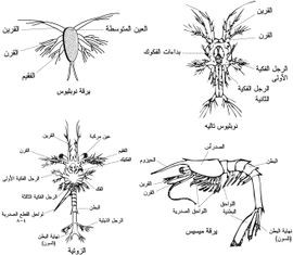 - البنيدات Penaeidea وتزود أرجلها الثلاثة الأولى بملاقط، لكن الملقط الثالث أصغر من الملقطين الأول والثاني. يصل طول بعضها في المناطق الاستوائية إلى 30سم، ولا تحمل الإناث بيوضها؛ بل تلقيها في ماء البحر. من أجناسها المعروفة القريدس الشائع Penaeus (الشكل 3) الذي تفقس بيوضه لتعطي يرقة تسمى نوبليوس nauplius تنسلخ مرات عدة لتعطي يرقة أخرى تسمى نوبليوس تالية metanauplius ثم زوئية zoea ثم مايسيس mysis التي تتحول إلى حيوان بالغ (شكل 4).