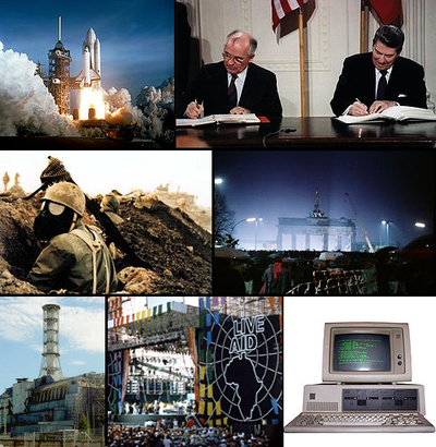 - انتخب رونالد ريگان رئيساً للولايات المتحدة عام 1980. في الشؤون الدولية، اتبع ريگان سياسة متشددة لمنع انتشار الشيوعية، وبدأ في حشد قوة عسكرية أمريكية ضخمة لتعدي الاتحاد السوڤيتي. بعدها تحدى مباشرة الستار الحديدي بطلبه من الاتحاد السوڤيتي إسقاط سور برلين.