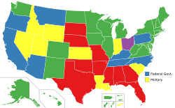 In the United States, capital punishment (killing a person as punishment for allegedly committing a crime) is a legal penalty throughout the country at the federal level, in 27 states, and in American Samoa.[ب][1] It is also a legal penalty for some military offenses. Capital punishment has been abolished in 23 states and in the federal capital, Washington, D.C.[2] It is usually applied for only the most serious crimes, such as aggravated murder. Although it is a legal penalty in 27 states, 19 of them have authority to execute death sentences, with the other 8, as well as the federal government and military, subject to moratoriums.