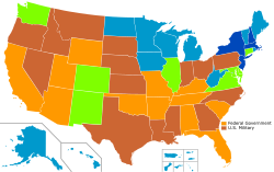In 1982, Texas carried out the first execution by lethal injection in world history and lethal injection subsequently became the preferred method throughout the country, displacing the electric chair.[78] From 1976 to December 8, 2016, there were 1,533 executions, of which 1,349 were by lethal injection, 163 by electrocution, 11 by gas inhalation, 3 by hanging, and 3 by firing squad.[79] The South had the great majority of these executions, with 1,249; there were 190 in the Midwest, 86 in the West, and only 4 in the Northeast. No state in the Northeast has conducted an execution since Connecticut, now abolitionist, in 2005. The state of Texas alone conducted 571 executions, over 1/3 of the total; the states of Texas, Virginia (now abolitionist), and Oklahoma combined make up over half the total, with 802 executions between them.[80] 17 executions have been conducted by the federal government.[81] Executions increased in frequency until 1999; 98 prisoners were executed that year. Since 1999, the number of executions has greatly decreased, and the 17 executions in 2020 were the fewest since 1991.[8] A 2016 poll conducted by Pew Research, found that support nationwide for the death penalty in the U.S. had fallen below 50% for the first time since the beginning of the post-Gregg era.[82]