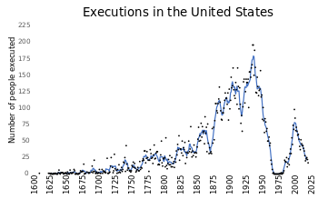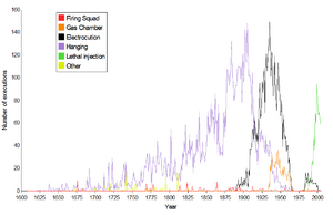 The Espy file,[23] compiled by M. Watt Espy and John Ortiz Smykla, lists 15,269 people executed in the United States and its predecessor colonies between 1608 and 1991. From 1930 to 2002, there were 4,661 executions in the United States; about two-thirds of them in the first 20 years.[24] Additionally, the United States Army executed 135 soldiers between 1916 and 1961 (the most recent).[25][26][27]
