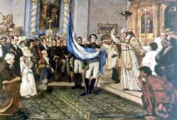 Here is the idolized flag, the flag that Belgrano left to us, when the sad enslaved Homeland bravely broke its bonds. Here is the splendorous flag that surprised the world with its victory, when arrogant and victoriously during the fight climbed the top of the Andes Here is the flag that one day triumphantly rose in the middle of the battle and, full of pride and gallantry, went immortally to San Lorenzo Here it is, like the shining sky, showing sublimate majesty after having crossed the continent shouting in its way: "Freedom!" " Freedom! Freedom!"