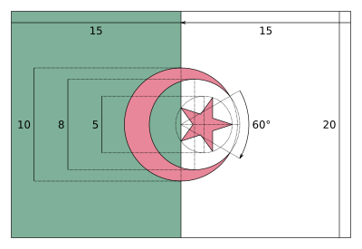 - أما الهلال فيرسم من تقاطع دائرتين كبيرة تتوسط العلم وأخرى صغيرة. يكون نصف قطر الدائرة الكبرى ربع 1/4 عرض العلم، أما الصغرى فخمسه 1/5.
