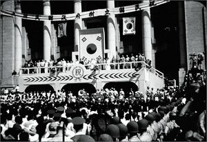 After the restoration of Korean independence in 1945, the Taegukgi remained in use after the southern portion of Korea became a republic under the influence of the United States but also used by the People's Republic of Korea. At the same time, the flag of the United States was also used by the United States Army Military Government in Korea along with the Taegukgi. Following the establishment of the South Korean state in August 1948, the current flag was declared official by the government of South Korea on 15 October 1949,[1] although it had been used as the de facto national flag before then.[9]