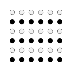 The law of similarity states that elements within an assortment of objects are perceptually grouped together if they are similar to each other in shape, colour, size etc. For example, the figure illustrating the law of similarity portrays 36 circles all equal distance apart from one another forming a square. In this depiction, 18 of the circles are shaded dark, and 18 of the circles are shaded light. We perceive the dark circles as grouped together and the light circles as grouped together, forming six horizontal lines within the square of circles. This perception of lines is due to the law of similarity.[37]