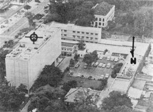 Aerial view of the US Embassy, Saigon, showing chancery building (left), parking lot (center) and Consulate compound and French Embassy (top)