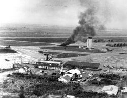 On 28 April, Tan Son Nhut Air Base (next to the airport) came under artillery fire and attack from Vietnamese People's Air Force aircraft. The fixed-wing evacuation was terminated and Operation Frequent Wind began. During the fixed-wing evacuation 50,493 people (including 2,678 Vietnamese orphans) were evacuated from Tan Son Nhut.[3] The evacuation took place primarily from the Defense Attaché Office compound, beginning around 14:00 on the afternoon of 29 April, and ending that night with only limited small arms damage to the helicopters. The U.S. Embassy in Saigon was intended to only be a secondary evacuation point for embassy staff, but it was soon overwhelmed with evacuees and desperate South Vietnamese. The evacuation of the embassy was completed at 07:53 on 30 April, but some Americans chose to stay or were left behind and some 400 third-country nationals were left at the embassy.