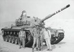 Egyptian soldiers pose in front of an intact Israeli M60 tank captured during Operation Badr.