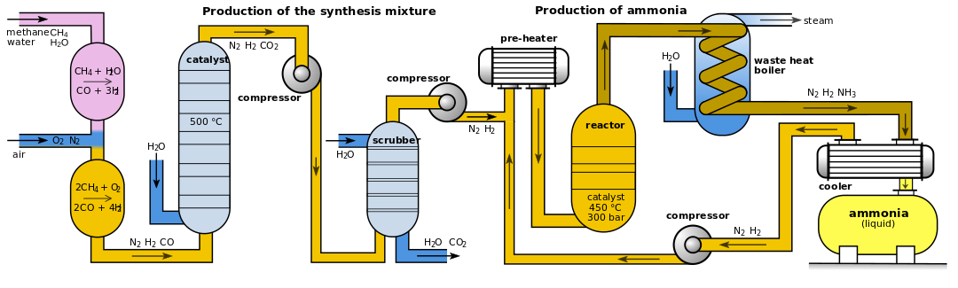 Modern ammonia plants produce more than 3000 tons per day in one production line. The following diagram shows the set-up of a modern (designed in the early 1960s by Kellogg[59]) "single-train" Haber–Bosch plant: