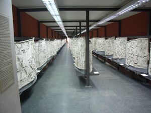 Trajan's Column was originally flanked by two sections of the Ulpian Library, a Greek chamber and a Latin chamber, which faced each other and had walls lined with niches and wooden bookcases for scrolls.[6][7][8] The Latin chamber likely contained Trajan's commentary on the Roman-Dacian Wars, the Dacica, which most scholars agree was intended to be echoed in the spiralling, sculpted narrative design of Trajan's Column.[9]