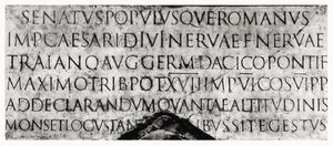 The Senate and People of Rome, to the Divine Emperor Caesar Nerva Trajan, son of Nerva, High Priest, [conqueror of] Germany and Dacia, [vested] with the power of the tribune 17 [times], imperator 6 [times], consul 6 [times], father of the nation, for demonstrating [that] a mountain and a place of such height were excavated for such works.[24]