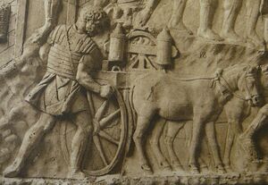 It is assumed that the column drums were lifted by cranes into their place.[3][32] Ancient sources, as well as a substantial body of archaeological evidence, show that Roman engineers were capable of raising large weights clear off the ground. The typical drum of Trajan's Column weighs c. 32 t,[2] while the capital, the heaviest block above the base and pedestal, is even at 53.3 t, which had to be lifted 34 m (112 ft) high.[3] To save weight, the treads had probably been carved out before either at the quarry or in situ.[30][33]