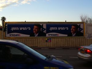 Peretz campaign billboard, Tel Aviv, January 2006. "Ki Higía' Haz'mán" – "Because The Time Has Come"
