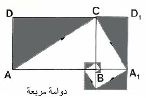 ABCD هو مستطيل الذهبي بقطر AC. من النقطة C يرسم خط عمودي CA (من الجانب الأصغر) حتى يلتقي امتداد CA1 . المستطيل CBA1D1 هو أيضا مستطيل ذهبي. بتكرار هذه العملية يمكن إنشاء العديد من المستطيلات الذهبية. أقطار هذه المستطيلات تُسمى دوامة مربعة ؛ أما إذا رسمنا الخط العمودي على AC , حتى التقاء امتداد الضلع الأصغر AD, ، فيمكن إنشاء دوامة عكسية.