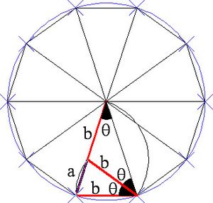 واحدة من أهم خصائص النسبة الذهبية هي ما يلي : إذا قاعدة b لمثلث متساوي الساقين هي النسبة الذهبية للضلع a+b ، يعني أن زاوية الرأس θ هي خمس الزاوية المستقيمة، أي ان القاعدة هي ضلع عشاري منتظم محاط بدائرة نصف قطرها نفس الضلع a+b .