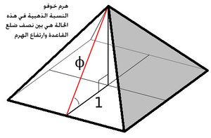 والقضية الأكثر إثارة للمناقشة والمتعلة بمصر هي وجود هذا النسبة الذهبية في هرم خوفو . النسبة الذهبية في هذه الحالة بين نصف ضلع القاعدة وارتفاع الهرم ، والذي من شأنه أن يؤدي إلى ميل للواجهة = 51 ° 49 . الهرم الذي يبلغ ارتفاعه الحقيقي نحو 147 م وطول الضلع, أي 186.64\115= 1.6229 قيمة قريبة جداً من النسبة الذهبية.[2]