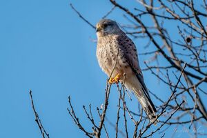 The term kestrel (from فرنسية: crécerelle, derivative from crécelle, i.e. ratchet) is the common name given to several species of predatory birds from the falcon genus Falco. Kestrels are most easily distinguished by their typical hunting behaviour which is to hover at a height of around 10–20 متر (35–65 ft) over open country and swoop down on ground prey, usually small mammals, lizards or large insects, while other falcons are more adapted for active hunting during flight.