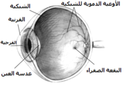 1. القطعة الأمامية 2. الحاشية المشرشرة 3. العضلة الهدبية 4. النطيقة الهدبية 5. قناة شليم 6. البؤبؤ (حدقة العين) 7. الغرفة الأمامية 8. القرنية 9. القزحية 10. قشرة العدسة 11. نواة العدسة 12. النواتئ الهدبية 13. الملتحمة 14. العضلة المائلة السفلية 15. العضلة المستقيمة السفلية 16. العضلة المستقيمة الداخلية (الإنسية) 17. شرايين وأوردة الشبكية 18. القرص البصري 19. الأم الجافية 20. شريان الشبكية المركزي 21. وريد الشبكية المركزي 22. العصب البصري 23. الوريد الدواري 24. غمد المقلة 25. البقعة 26. النقرة 27. الصلبة 28. المشيمية 29. العضلة المائلة العلوية 30. الشبكية.
