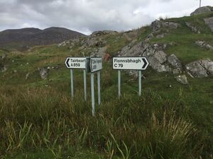 Some monolingual Gaelic road signs, particularly direction signs, are used on the Outer Hebrides, where a majority of the population can have a working knowledge of the language. These omit the English translation entirely.