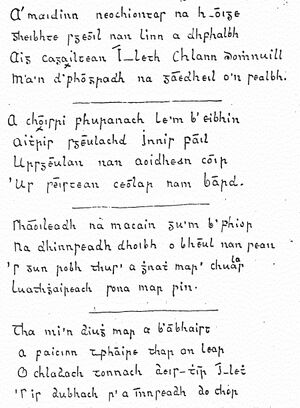 - ^ The Board of Celtic Studies Scotland (1998) Computer-Assisted Learning for Gaelic: Towards a Common Teaching Core. The orthographic conventions were revised by the Scottish Qualifications Authority (SQA) in 2005: "Gaelic Orthographic Conventions 2005". SQA publication BB1532. August 2005. Archived from the original on 7 May 2007. Retrieved 24 March 2007.