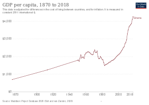 A series of alternating military and civilian governments, often affected by economic instabilities,[75] ruled Ghana from 1966, ending with the ascent to power of Flight Lieutenant Jerry John Rawlings of the Provisional National Defence Council in 1981.[76] These changes resulted in the suspension of the constitution in 1981 and the banning of political parties.[77] The economy soon declined, so Rawlings negotiated a structural adjustment plan, changing many old economic policies, and growth recovered during the mid-1980s.[77] A new constitution restoring multi-party system politics was promulgated in the presidential election of 1992, in which Rawlings was elected, and again in the general election of 1996.[78]