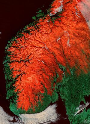 The fjords of western Norway formed in connection to the east-ward tilting of much of Norway during the Cenozoic uplift of the Scandinavian Mountains. This uplift, that occurred long before the Quaternary glaciations, enabled rivers to incise deeply the Paleic relief.[8][9] A study of Sognefjord suggest that the fluvial and glacial erosion that made the fjords has followed structural weaknesses in the crust. The headvalleys in particular seem to located at structural weakness zones.[10] Western Norway bears some resemblance to other passive margins at lower latitudes like eastern Australia. In both cases a table land is dissected by valleys forming a great escarpment. The main differences is that in Norway valley and fjord bottoms have been widened by glacier erosion, valley sides steepened, and the outer regions of valleys straightened, also by glacier erosion.[11]