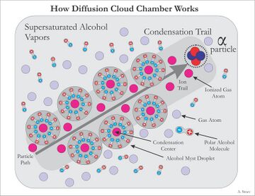 Isopropanol, methanol, or other alcohol vapor saturates the chamber. The alcohol falls as it cools down and the cold condenser provides a steep temperature gradient. The result is a supersaturated environment. As energetic charged particles pass through the gas they leave ionization trails. The alcohol vapor condenses around gaseous ion trails left behind by the ionizing particles. This occurs because alcohol and water molecules are polar, resulting in a net attractive force toward a nearby free charge (See Fig. 4). The result is a misty cloud-like formation, seen by the presence of droplets falling down to the condenser. When the tracks are emitted from a source, their point of origin can easily be determined.[1] Fig. 5 shows an example of an alpha particle from a Pb-210 pin-type source undergoing Rutherford scattering.