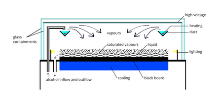 Fig. 3: A diffusion-type cloud chamber. Alcohol (typically isopropanol) is evaporated by a heater in a duct in the upper part of the chamber. Cooling vapor descends to the black refrigerated plate, where it condenses. Due to the temperature gradient, a layer of supersaturated vapor is formed above the bottom plate. In this region, radiation particles induce condensation and create cloud tracks.