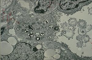 خلية سنخية من النمط الثاني .. بامكانك ملاحظة مغادرة "الجسم العديد الصفاحات" الحامل للفاعل بالسطح لهذه الخلية عند الخطوط الحمراء(لرؤوية أفضل كبر الصورة)