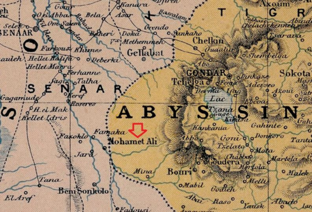 لاحظ أن النيل الأزرق كان يشكل الحدود بين الحبشة والسودان المصري الإنجليزي.