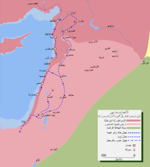خارطة تُظهرُ مسير الجُيوش الإسلاميَّة لِفتح الشَّام.