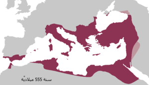 الإمبراطوريَّة البيزنطيَّة في أقصى اتساعها زمن القيصر جُستنيان الكبير، وتبدو على حُدودها اليُمنى مملكة الغساسنة مُظللة باللون الورديّ.