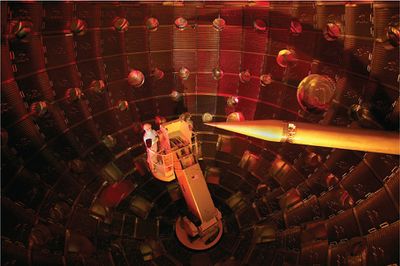 لا تبدو المنشأة NIF ذات أهمية من الخارج. فهي عبارة عن بناء من دون نوافذ وحجمه يقارب حجم حظيرة طائرات، وهو مطليٌ بلون بني فاتح بحيث لا يبدو مغايرا لأي مكتب في متنزه ضاحية من الضواحي. ولكن مثل معظم المشاريع العلمية الكبيرة - كالمصادم الهادروني الضخم الذي يخطر على البال فورا - إن ما يثير الرعب هو الأشياء المدفونة عميقا في داخله. توجد في داخل هذه المنشأة دستات من أنابيب عرضها متر ممدودة عبر المنشأة. وتنتهي الأنابيب إلى حجرة الهدف التي هي عبارة عن ثلاثة أدوار مزودة بفتحات لتمكين الليزرات من العبور من خلالها. وفي مركز هذه الحجرة يوجد هدف الديتيريوم والتريتيوم مستقرا في مكانه بواسطة ما يبدو كرأس قلم الرصاص. وستتركز الليزرات إلى ما يقرب من بضعة ميليِّمترات من النقطة المركزية حيث ستسحق الهدف مولدةً قدرا من الطاقة - على الأقل لجزء قليل من الثانية - يلبي احتياجات الأمة جميعها من الطاقة الكهربائية.