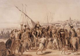 استقبال ميراندا في لا گوايرا، يوهان موريتس روگنداس. وفد من القيادة العسكرية العليا لكراكاس، وضمنهم بوليڤار، وحشد من العامة، يستقبلون ميراندا بحفاوة. (القرن 19. مجموعة مؤسسة جون بولتون، كراكاس، ڤنزويلا.)