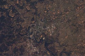 The city is located in the inner Bluegrass region of Kentucky.[6] The Kentucky River flows through the city, making a turn as it passes through the center of town; the Downtown and South Frankfort districts are opposite one another on each side of the river. The suburban areas on either side of the river valley are known as East and West Frankfort. Frankfort has four distinct seasons; winter is normally cool with some snowfall, while summers are hot and humid.[7][8]