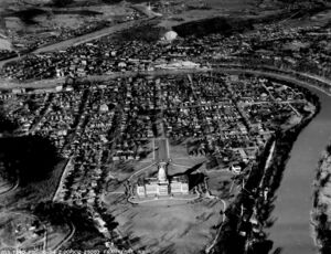 Frankfort grew considerably with state government in the 1960s. A modern addition to the State Office Building was completed in 1967. The original building was completed in the 1930s on the location of the former Kentucky State Penitentiary. Some of the stone from the old prison was used for the walls surrounding the office building.[24]