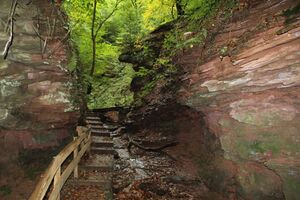 In 1991 UNESCO recognised the Rhön as a biosphere reserve.[20] Among the most picturesque geotopes in Bavaria, are the Franconian sites of Fossa Carolina, the Twelve Apostle Rocks (Zwölf-Apostel-Felsen), the Ehrenbürg, the cave ruins of Riesenburg and the lake of Frickenhäuser See.[21] The European Bird Reserves in Franconia are found mainly in uplands like the Steigerwald, in large forests like Nuremberg's Imperial Forest or along rivers like the Altmühl.[22] There are also numerous Special Areas of Conservation and protected landscapes. In Franconia there are very many tufas, raised stream beds near river sources within the karst landscape that are known as 'stone runnels' (Steinerne Rinnen). There are protected examples at Heidenheim and Wolfsbronn.