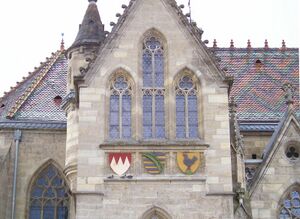 From the 12th century Nuremberg Castle was the seat of the Burgraviate of Nuremberg. The burgraviate was ruled from about 1190 by the Zollerns, the Franconian line of the later House of Hohenzollern, which provided the German emperors of the 19th and 20th century.[65] Under the Hohenstaufen kings, Conrad III and Frederick Barbarossa, Franconia became the centre of power in the Empire. During the time when there was no emperor, the Interregnum (1254–1273), some territorial princes became ever more powerful. After the Interregnum, however, the rulers succeeded in re-establishing a stronger royal lordship in Franconia.[66] Franconia soon played an important role again for the monarchy at the time of Rudolf of Habsburg; the itineraries of his successors showing their preference for the Rhine-Main region. In 1376 the Swabian League of Cities was founded and was joined later by several Franconian imperial cities.[67] During the 13th century the Teutonic Order was formed, taking over its first possession in Franconia in 1209, the Bailiwick of Franconia. The foundation of many schools and hospitals and the construction of numerous churches and castles in this area goes back to the work of this Roman Catholic military order. The residence place of the bailiwick was at Ellingen until 1789 when it was transferred to today's Bad Mergentheim.[68] Other orders such as the Knights Templar could not gain a foothold in Franconia; the Order of St. John worked in the Bishopric of Würzburg and had short term commands.[69]