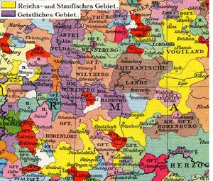 - ^ أ ب Karten zur Geschichte Bayerns: Helmut Flachenecker, in: Edel und Frei. Franken im Mittelalter, ed. by Wolfgang Jahn / Jutta Schumann / Evamaria Brockhoff, Augsburg, 2004 (Veröffentlichungen zur Bayerischen Geschichte und Kultur 47/04), pp. 308–313, Cat. No. 134. See House of Bavarian History Archived 4 مارس 2016 at the Wayback Machine