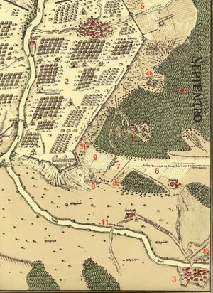 In 1608, the reformed princes merged into a so-called Union within the Empire. In Franconia, the margraves of Ansbach and Bayreuth as well as the imperial cities were part of this alliance. The Catholic side responded in 1609 with a counter-alliance, the League. The conflicts between the two camps ultimately resulted in the Thirty Years' War, which was the greatest strain on the cohesion of the Franconian Circle[83] Initially, Franconia was not a theatre of war, although marauding armies repeatedly crossed its territory. However, in 1631, Swedish troops under Gustavus Adolphus advanced into Franconia and established a large encampment in summer 1632 around Nuremberg.[84] However, the Swedes lost the Battle of the Alte Veste against Wallenstein's troops and eventually withdrew. Franconia was one of the poorest regions in the Empire and lost its imperial political significance.[85] During the course of the war, about half the local population lost their lives. To compensate for these losses about 150,000 displaced Protestants settled in Protestant areas, including Austrian exiles.[86]