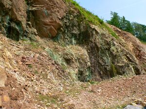 Only in the extreme northeast of Franconia and in the Spessart are there Variscan outcrops of the crystalline basement, which were uplifted from below the surface when the Alps exerted a northwards-oriented pressure. These are rocks of pre-Permian vintage, which were folded during various stages of Variscan orogeny in the Late Palaeozoic - before about 380 to 300 million years ago - and, in places, were metamorphosed under high pressure and temperature or were crystallized by ascending magma in the Earth's crust.[25] Rocks which were unchanged or only lightly metamorphosed, because they had been deformed at shallow crustal depths, include the Lower Carboniferous shale and greywacke of Franconian Forest. The Fichtel mountains, the Münchberg Plateau and the Spessart, by contrast, have more metamorphic rocks (phyllite, schist, amphibolite, gneiss). The Fichtel mountains are also characterized by large granite bodies, called post-kinematic plutons which, in the late phase of Variscan orogeny, intruded into the metamorphic rocks. In most cases these are S-type granites whose melting was caused by heated-up sedimentary rocks sunk deep into the Earth's crust.[26] While the Fichtel and Franconian Forest can be assigned to the Saxo-Thuringian Zone of Central European Variscan orogeny, the Spessart belongs to the Central German Crystalline Zone.[25] The Münchberg mass is variously attributed to the Saxo-Thuringian or Moldanubian Zones.[27]