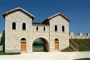 Under the emperors, Domitian (81-96), Trajan (98-117) and Hadrian (117-138), the Rhaetian Limes was built as a border facing the Germanic tribes to the north. This defensive line ran through the south of Franconia and described an arc across the region whose northernmost point lay at present-day Gunzenhausen. To protect it, the Romans built several forts like Biriciana at Weißenburg, but by the mid-third century, the border could no longer be maintained and by 250 A.D. the Alemanni occupied the areas up to the Danube. Fortified settlements such as the Gelbe Bürg at Dittenheim controlled the new areas.[57] More such Gau forts have been detected north of the former Limes as well. To which tribe their occupants belonged is unknown in most cases. However, it is likely that it was mainly Alemanni and Juthungi in especially in the south.[58]