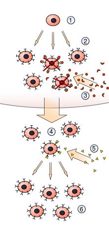 Clonal selection (1) A hematopoietic stem cell undergoes differentiation and genetic rearrangement to produce (2) immature lymphocytes with many different antigen receptors. Those that bind to (3) antigens from the body's own tissues are destroyed, while the rest mature into (4) inactive lymphocytes. Most of these will never encounter a matching (5) foreign antigen, but those that do are activated and produce (6) many clones of themselves.