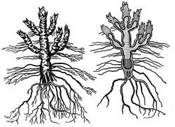 تكاثر بالفسائل الأصناف التي لا تعطي المدادات الخضرية بتفصيص نباتات الأمهات في الزراعات القديمة؛ للحصول على شتلات تحوي كل منها ساقاً قصيرة، ومجموعة جذرية جيدة، وبعض البراعم. أما الأصناف القادرة على تكوين طرود زاحفة فتكاثر بها وهي الطريقة الأكثر شيوعاً، إذ تنتخب نباتات أمهات جيدة النمو والإنتاج وتزرع في المشتل في الخريف للحصول على شتلات للزراعة من دون تخزين، أما النباتات التي سوف تخزن فتزرع في الربيع. ويتم قلع النباتات من بداية آب حتى منتصف أيلول/سبتمبر على ألا يقل طول مجموعتها الجذرية عن 15سم (الشكل 4).