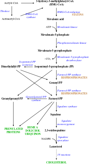 FH is usually treated with statins.[10] Statins act by inhibiting the enzyme hydroxymethylglutaryl CoA reductase (HMG-CoA-reductase) in the liver. In response, the liver produces more LDL receptors, which remove circulating LDL from the blood. Statins effectively lower cholesterol and LDL levels, although sometimes add-on therapy with other drugs is required, such as bile acid sequestrants (cholestyramine or colestipol), nicotinic acid preparations or fibrates.[34][4] Control of other risk factors for cardiovascular disease is required, as risk remains somewhat elevated even when cholesterol levels are controlled. Professional guidelines recommend that the decision to treat a person with FH with statins should not be based on the usual risk prediction tools (such as those derived from the Framingham Heart Study), as they are likely to underestimate the risk of cardiovascular disease; unlike the rest of the population, FH have had high levels of cholesterol since birth, probably increasing their relative risk.[35] Prior to the introduction of the statins, clofibrate (an older fibrate that often caused gallstones), probucol (especially in large xanthomas) and thyroxine were used to reduce LDL cholesterol levels.